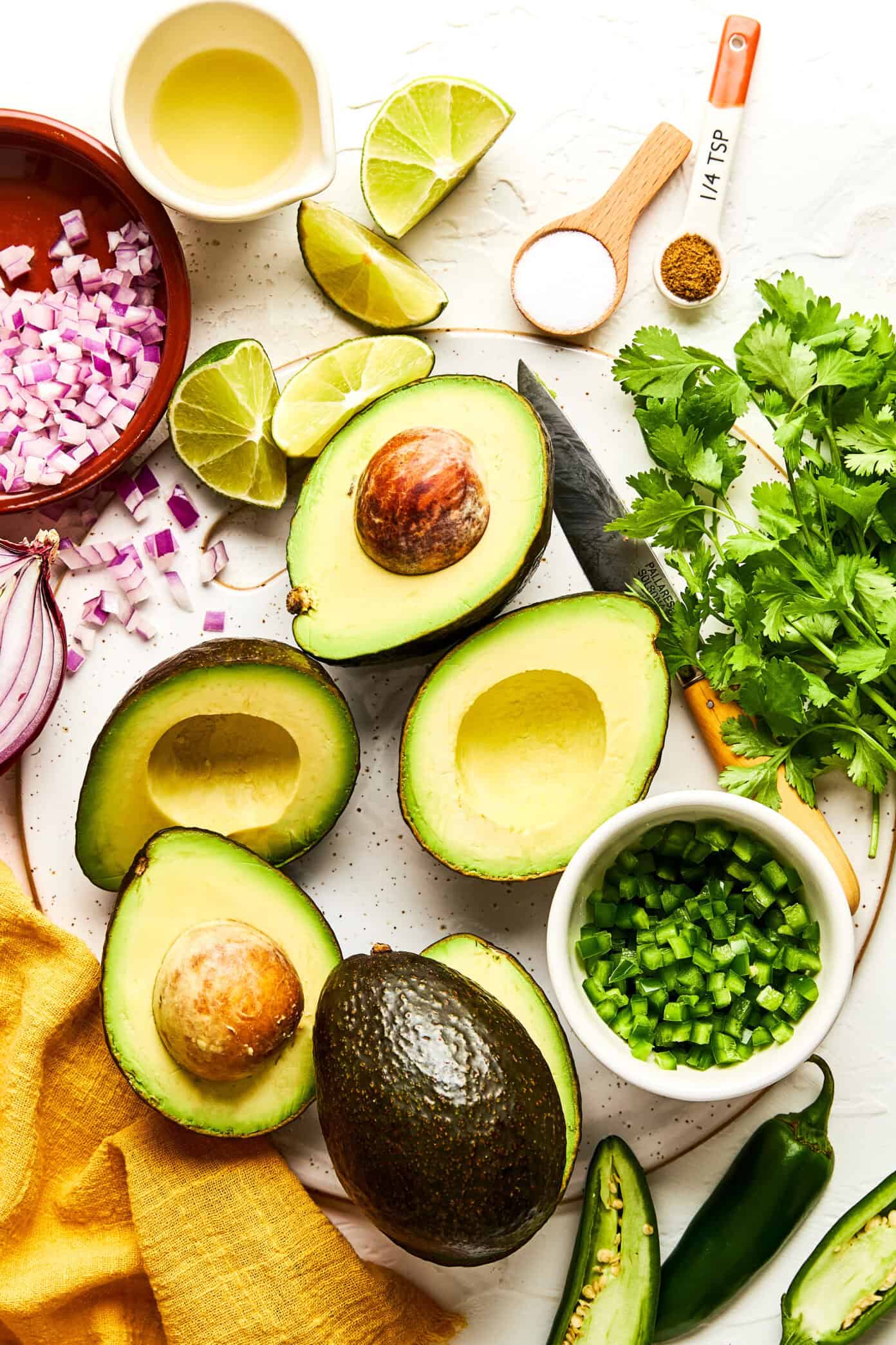 To make this easy guacamole recipe, simply gather up the following guacamole ingredients: