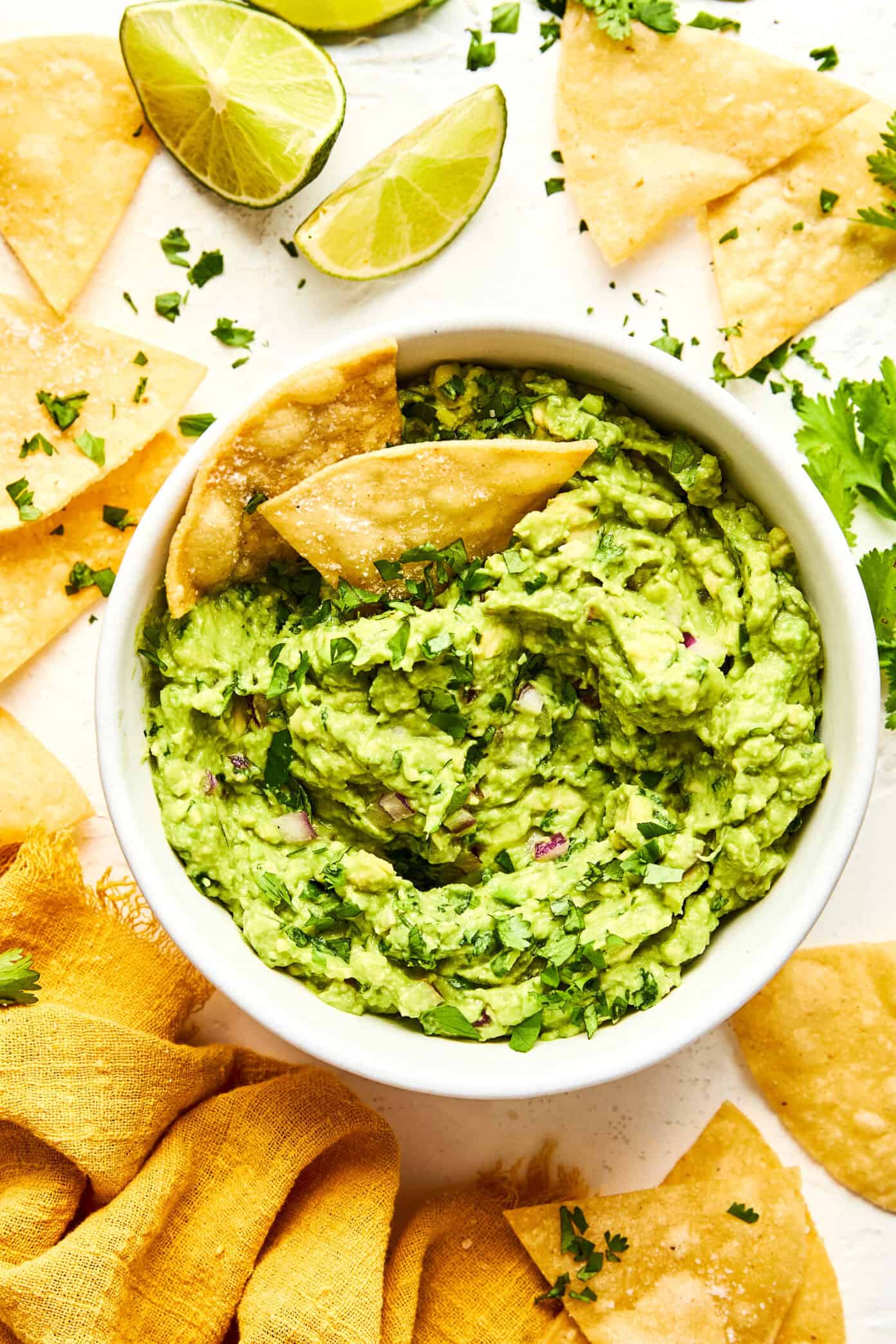 Of course, there are a million ways to use put this guacamole recipe to delicious use as well. It’s perfect for spreading on toast and burgers, topping your tacos and nachos, loading up your baked potatoes and deviled eggs, filling your quesadillas and wraps, and serving alongside any number of Mexican dishes. But about 99% of the time, we just serve it up with a big bowl of tortilla chips (plus maybe some homemade salsa and a round of margaritas). And I’m telling you — this guac recipe is always, always a winner.