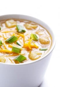 Stir in some cheese until it’s nice and ooey gooey and melted. And then serve the soup warm garnished with green onions and extra cheese. And voila!!!