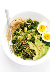 Then I shredded some Brussels sprouts and kale, and tossed them with a simply lemony mustard dressing. And then to add in a little extra protein, I also added in some leftover quinoa that I had on hand, which I loved. Made the salad part of the bowl a little more hearty. (Although it’s totally optional, of course.)