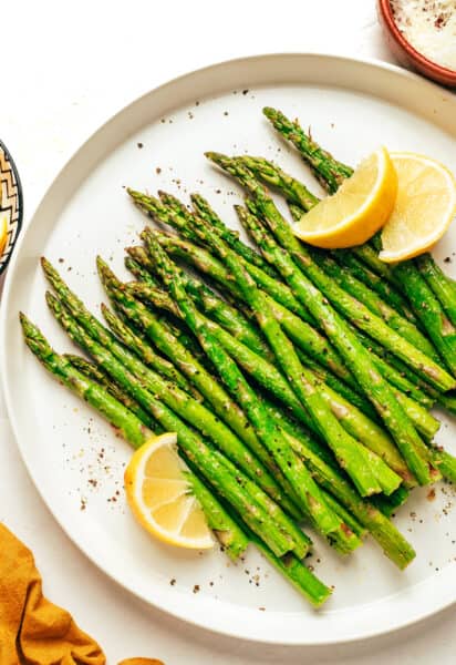 - Season. Toss the asparagus with olive oil, salt, garlic powder, and black pepper until evenly coated.