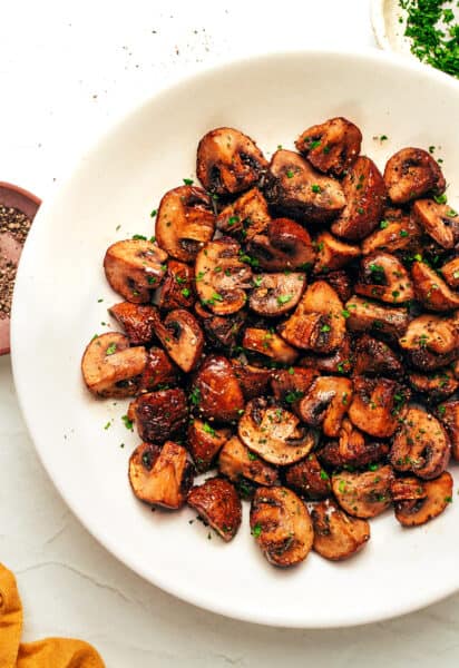- Air fry. Arrange mushrooms in an even layer in the air fryer basket. Cook at 380°F for 10–12 minutes, shaking the basket halfway through, until the mushrooms are browned and tender.