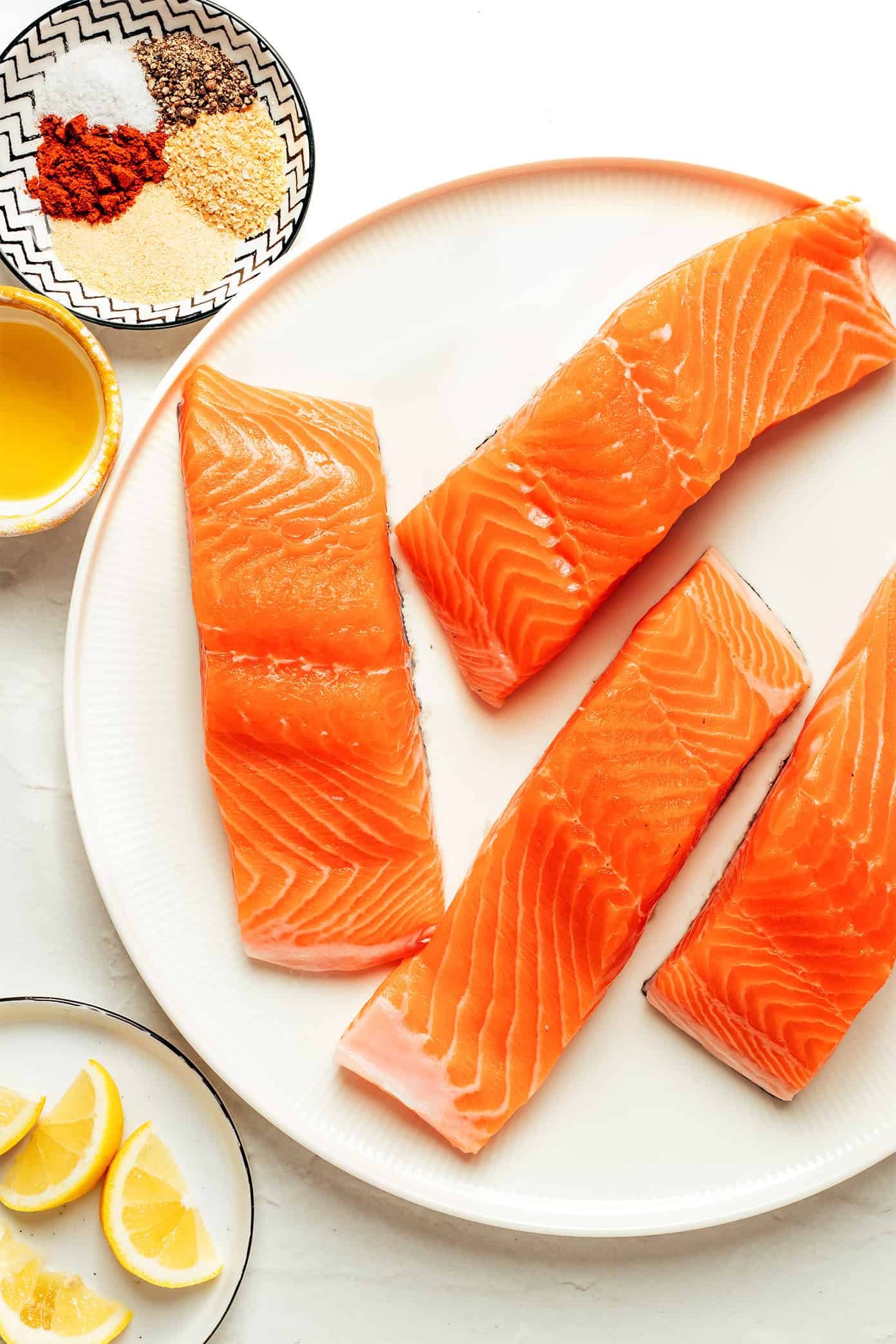 - Prep salmon: Pat salmon dry with paper towels. Drizzle with olive oil and rub evenly to coat. In a small bowl, mix garlic powder, onion powder, smoked paprika, salt, and pepper. Sprinkle evenly over the salmon and pat gently so the seasoning sticks.
