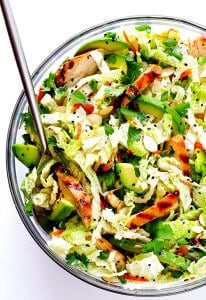 But of all the flavors I’ve tried, I always seem to come back to a classic — the sesame chopped salad. It seems like every brand (and most restaurants that serve salads) has a slightly different take on this salad, but the main ingredients are always the same — a cabbage-based slaw, a sesame vinaigrette, sliced almonds, and maybe some fried wonton strips and fresh cilantro and extra sesame seeds if you’re lucky. Definitely a good start…but if you’ve seen me make this salad on Snapchat (where it makes a pretty regular appearance), you might notice that I always soup mine up with some extra avocado and chicken. It’s just not quite the same without it. ;)