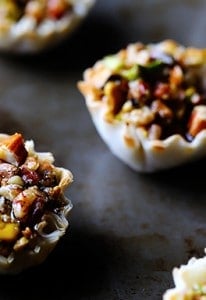 When I saw my friend Kristin’s recipe this week for spanakopita bites, they reminded me that I still had a few leftover boxes of phyllo cups sitting in my freezer. (Always good to have on hand!) And for some reason, her appetizer sparked the idea to turn one of my other favorite phyllo recipes into some little “cups” — baklava! I know that the process of making homemade baklava is fairly complex, but the actual ingredients themselves are super simple — just some nuts, honey, maybe a little butter, and phyllo dough.