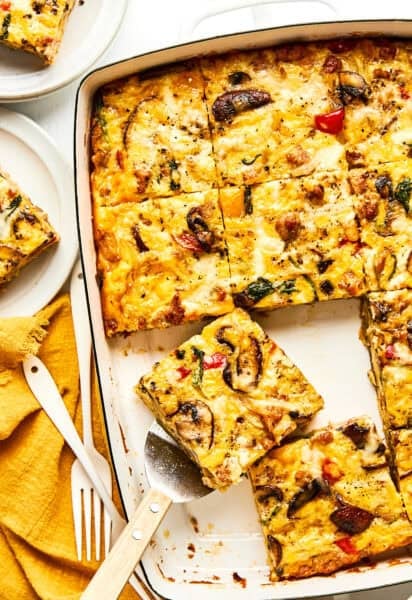 Transfer to a greased 9×13-inch baking dish. - Cook the sausage. In the same skillet, cook the breakfast sausage over medium-high heat, breaking it into crumbles, until browned and cooked through. Use a slotted spoon to transfer the cooked sausage to the baking dish, leaving behind 2 tablespoons of grease. (If there is excess grease, drain and discard it.)
