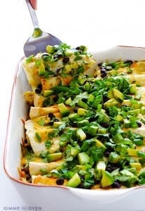 - Remove, and sprinkle the enchiladas evenly with the reserved avocado, fresh cilantro, black beans and green onions, or whatever toppings you desire.