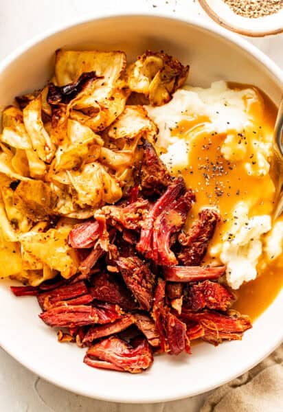 - Shred. Transfer the corned beef to a cutting board and let it rest for about 10 minutes while you make the gravy. Then shred into large, chunky pieces (not too fine — bigger pieces crisp best).