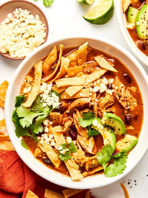 *If making this soup in the Instant Pot, it’s super easy to just add uncooked boneless skinless chicken breasts to the broth, and let them pressure cook along with the rest of the soup. After the quick release, remove and shred the chicken, then add it back to the soup. Or, you are welcome to just add pre-cooked diced or shredded chicken to the soup at the beginning.