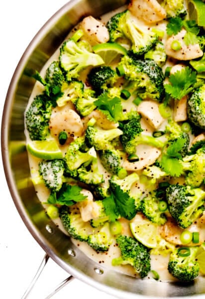 This one’s tossed with a fun, bright and tangy coconut lime sauce that you guys are going to love. The flavors here are inspired by one of my favorite Thai soups, that features a creamy coconut milk base mixed with zesty hints of ginger, garlic, and lemongrass. Lots of freshly-squeezed lime juice in there is also balanced out with a hint of honey, which also brings out the sweetness of the coconut milk. And altogether it tastes ultra-fresh and flavorful and pairs perfectly with a simple chicken and broccoli stir-fry.