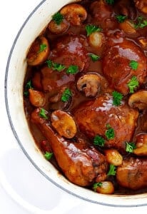 Learn how to make traditional Coq Au Vin (chicken in red wine) with this delicious French recipe. It’s surprisingly easy to make, and slow-simmered in the most heavenly, rich, and flavorful red wine sauce.