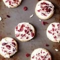 - Spread the frosting on the cooled cookies. Then immediately sprinkle the frosted cookies with the chopped dried cranberries. And use a fork to drizzle on the frosting, swishing it back and forth over the cookies.