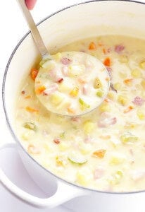 Seriously, this delicious recipe is everything I love in a warm soup during the wintertime. It’s nice and rich and creamy (using only milk, no heavy cream). It’s chock-full of veggies and garlic and lots of golden potatoes. It’s the perfect use for leftover ham (or even bacon) after a big holiday meal. And it can be ready to go from start to finish in just 30 minutes.