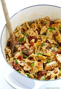 This creamy pasta with Chicken and Sun-Dried Tomatoes is made with a lighter creamy alfredo sauce, and tossed with chicken and sweet sun-dried tomatoes.