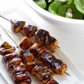 - Meanwhile or after, pour the reserved marinade into a small saucepan and bring to a boil over high heat. Reduce heat to medium-low and simmer for about 12 minutes, or until the mixture is reduced by half and is thick enough to coat the back of a spoon. (The glaze will thicken even more as it cools.) Remove from heat, and brush the glaze onto the skewers until they are all evenly coated. Serve warm.