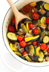 This easy ratatouille recipe is the perfect use for leftover summer veggies, it’s wonderfully fresh and flavorful and hearty, and it’s ultra-simple when sautéd together in a large pot (instead of the traditional method of neatly layering all of those veggies).