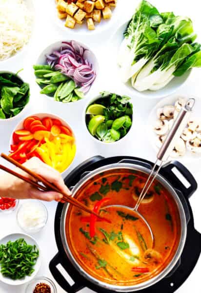 It’s a Thai spin on the traditional Chinese hot pot, made with a super simple broth packed with bold red curry flavors. And it’s super versatile for entertaining. It works well with noodles or rice, plus practically any veggies and herbs that you’d like to add in. It tastes great with tofu, chicken, shrimp or beef (although I generally keep mine meatless, in case there are any vegetarians in the group). Your guests can amp up the heat if they’d like a spicier curry, or they can opt to keep it more mild. But however you make it, I’m telling you, it is going to be downright delicious.