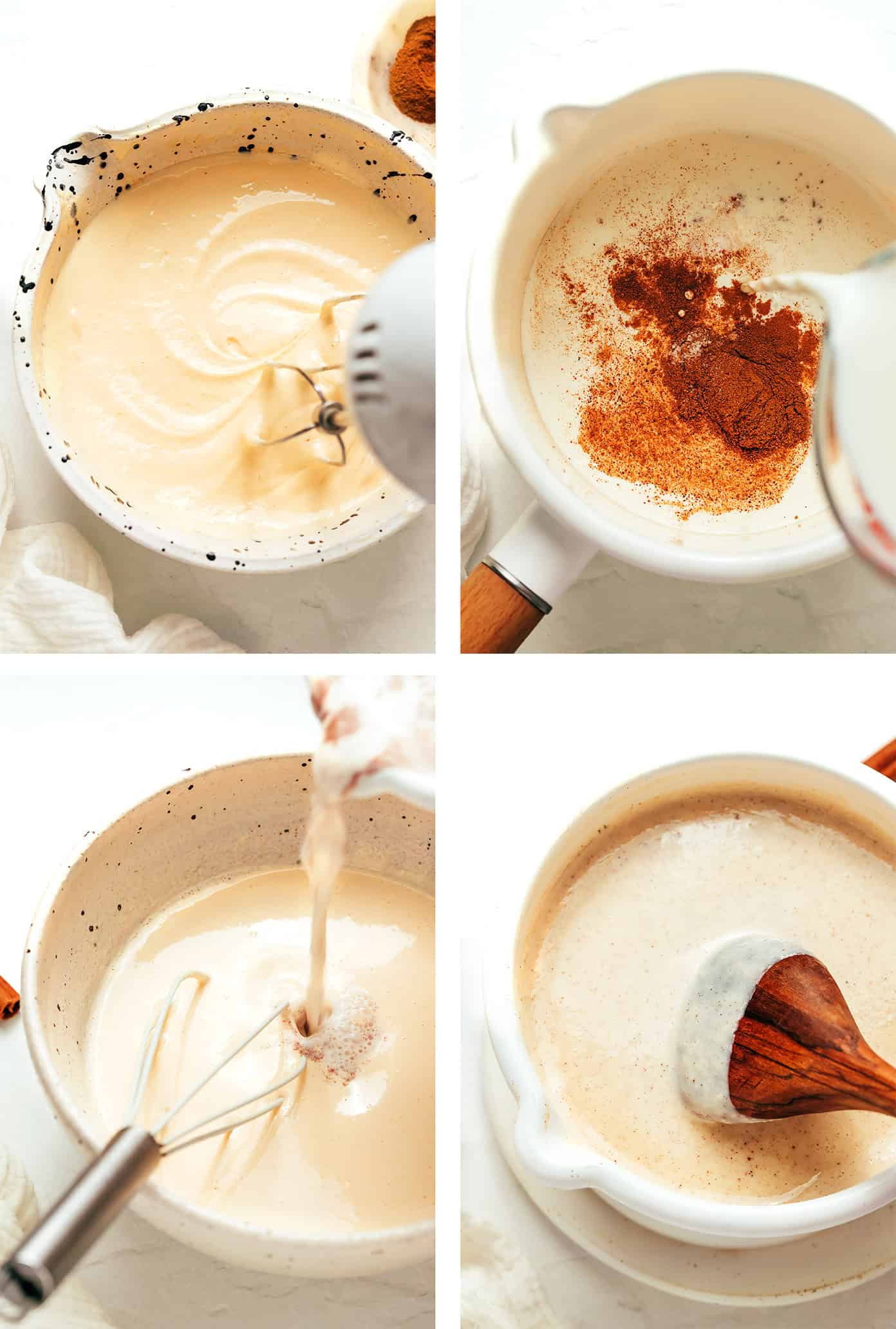 2. Heat the milk mixture. In a medium saucepan, combine the milk, cream, cinnamon, nutmeg, and salt. Warm over medium heat until steaming (donโ€™t let it boil).