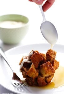Used up the last of the whipping cream and egg nog and all the random breads leftover from the holidays. Since eggs are scarce right now, I used half eggs, half egg whites. This recipe is super easy, very forgiving and absolutely delicious. An ice cream scoop is perfect for portioning and I used the pampered chef square brownie pan to bake them into little squares of goodness. The whiskey glaze is brilliant. 5 stars all around.