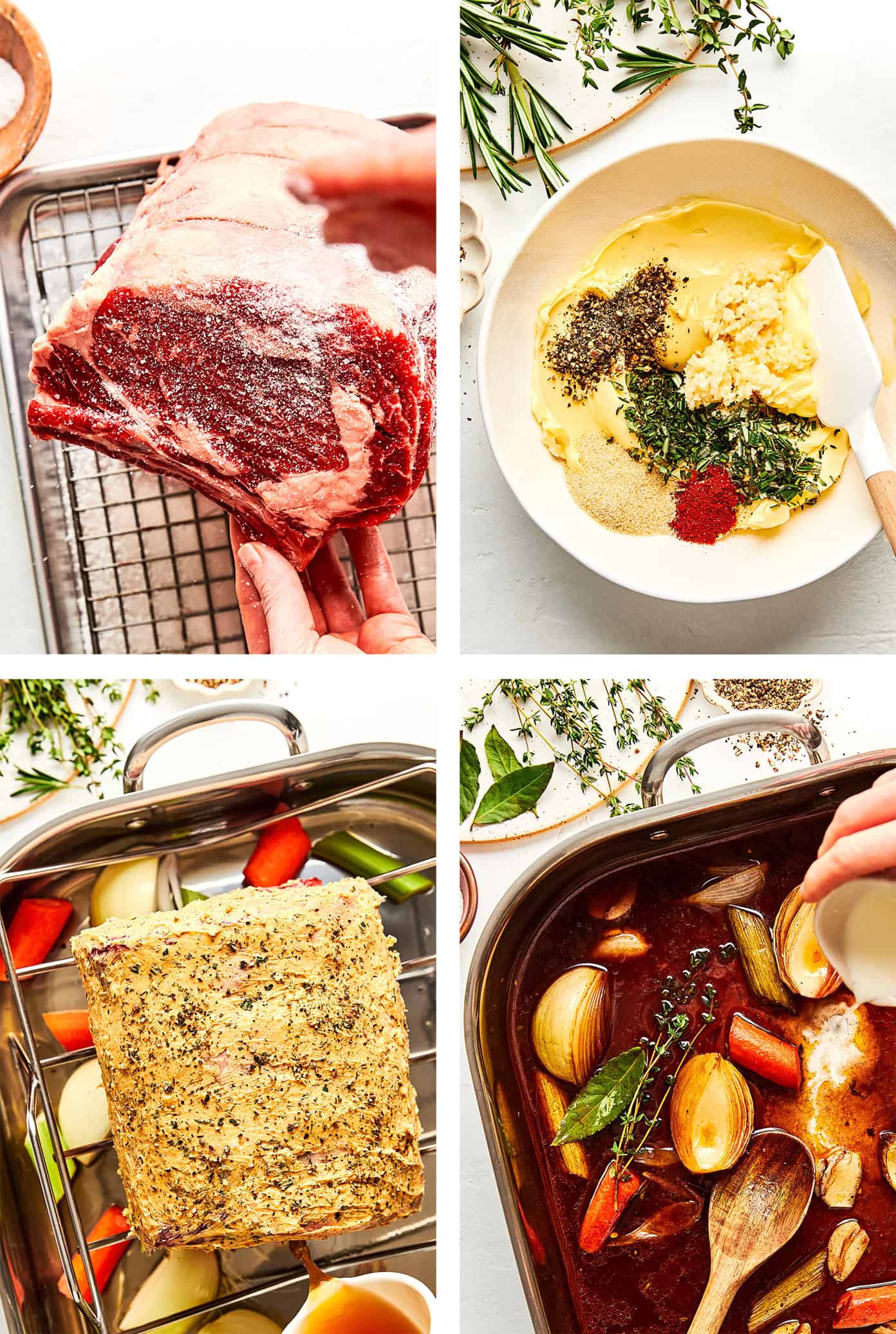 - Assemble the roasting pan. Scatter the onion, carrot, celery, and smashed garlic in the bottom of a large roasting pan. Pour in the beef stock or water. Set a roasting rack over the vegetables, place the roast on the rack (fat-cap side up), and spread the garlic-herb butter evenly all over the meat. Season the roast generously with extra freshly-ground black pepper.