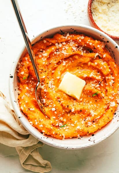 Inspired by the famous garlicky Parmesan sweet potato fries at one of my favorite local restaurants, these mashed sweet potatoes strike that irresistible balance of sweet and savory and seriously could not be more delicious.