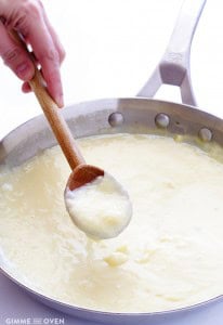 - Heat olive oil in a mediumย saute pan over medium-high heat. Add garlic and saute one minute, stirring occasionally, until fragrant. ย Pour in the stock-and-cornstarch slurry, and whisk until smooth. ย Whisk in milk, and bring the mixture to a simmer. Let cook for an additional minute or two until thickened. ย Then stir in Parmesan cheese, salt and pepper until the cheese is melted. ย Season with additional salt and pepper if necessary.
