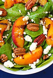 Tangy cheese, peppery arugula, and hea-ven-ly nutty toasted pecans. You’ll love Grilled Peaches, Arugula & Feta Salad recipe!