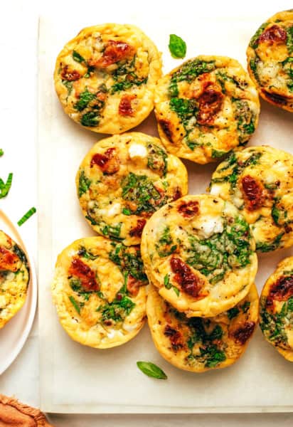 - Blend. Combine the eggs, cottage cheese and salt in a blender. Pulse a few times until smooth. Add in the sun-dried tomatoes, spinach, basil and stir by hand until evenly combined. Pour (or use a cookie scoop to help scoop) the mixture evenly into the 12 muffin cups. Top each cup with a sprinkle of feta and a twist of black pepper, if desired.