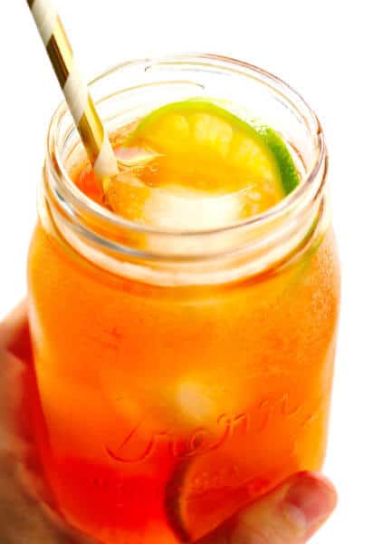 Add a bunch of ice to a highball glass, or really, any kind of glass. (Barclay used to drink from a collection of recycled spaghetti sauce jars as a bachelor, so we always serve ours in mason jars for old times’ sake.) ;) Then pour in all of the ingredients, stir to combine…