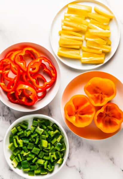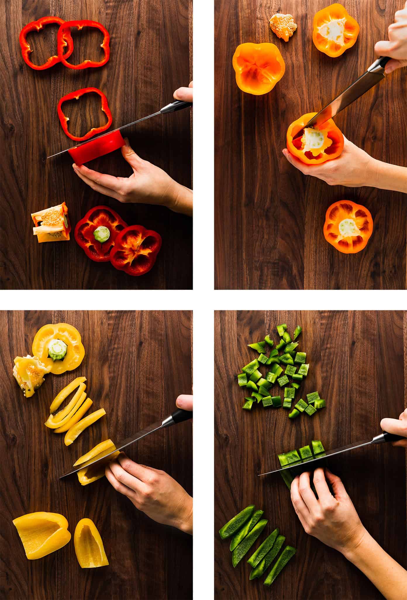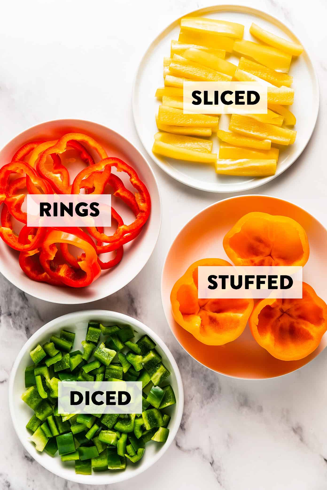 Learn how to cut a bell pepper four different ways — sliced, diced, in rings, and for stuffing. See the recipe video below for a step-by-step visual!