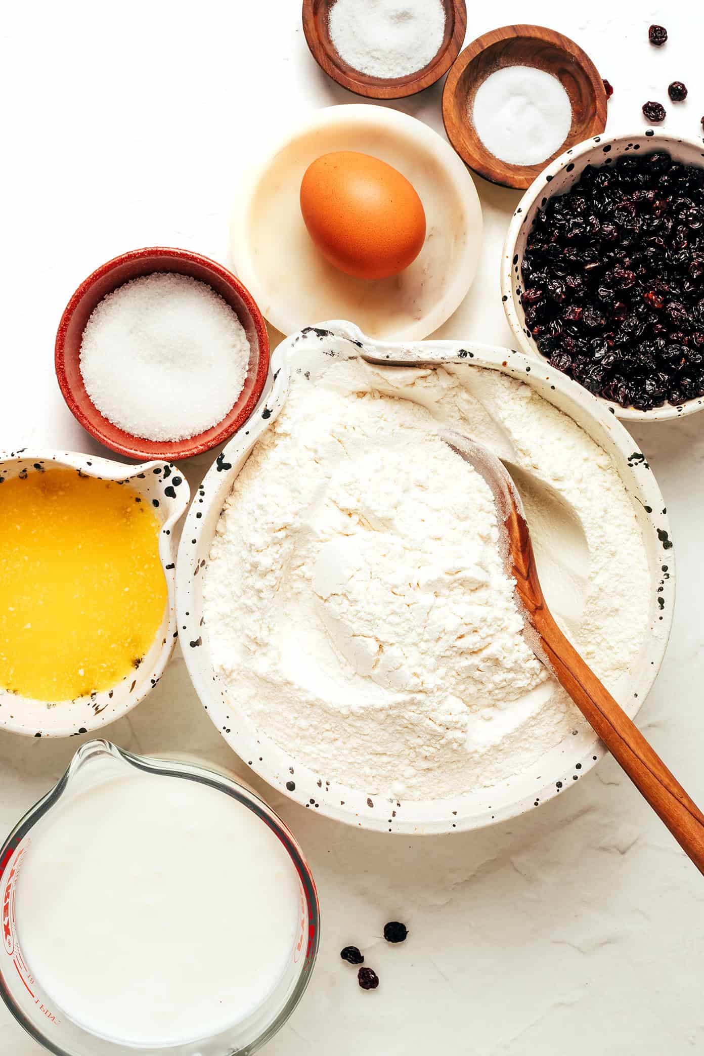 - Add the wet ingredients. In a separate bowl, whisk together the egg, buttermilk, and melted butter. Pour into the flour mixture and stir gently with a wooden spoon or spatula just until a shaggy dough forms. Avoid overmixing.