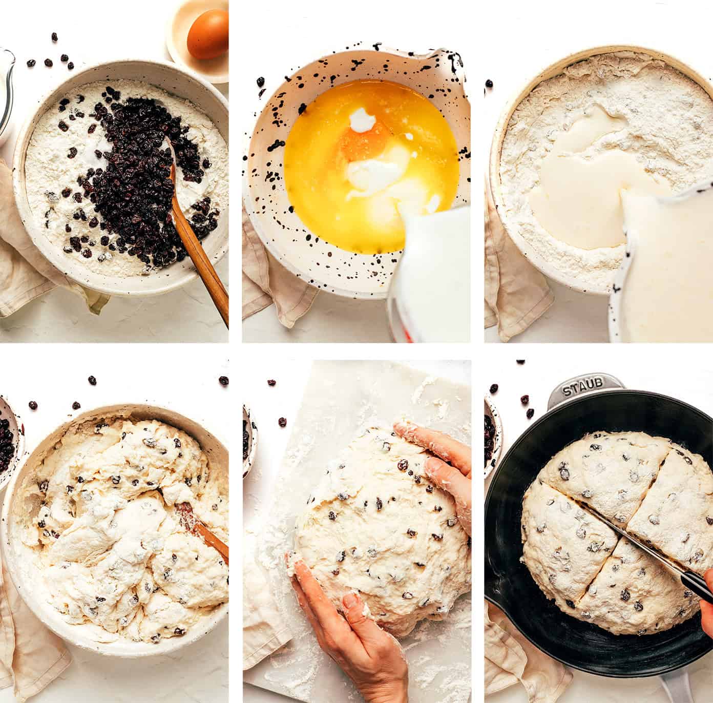 - Mix the dry ingredients. In a large bowl, whisk together the flour, salt, sugar, and baking soda until evenly combined. Stir in the currants, if using.