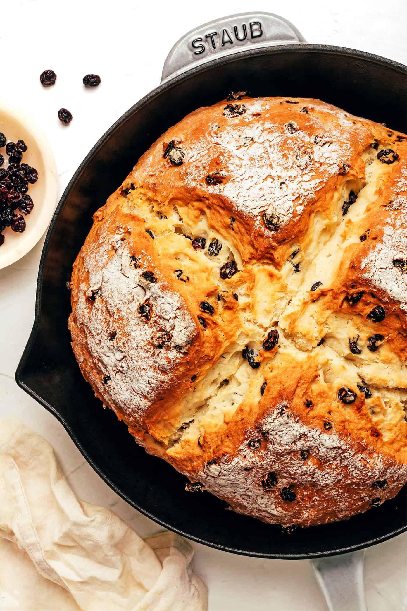 This easy Irish soda bread recipe is made with simple pantry ingredients and buttermilk, and baked into a tender, golden loaf with a crisp crust. Feel free to add currants if you would like!