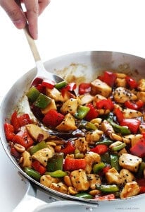 My dad ordered this dish religiouslyย at our neighborhood restaurant growing up, and it has long been one of my favorites as well. Because tender chicken, sauteed upย with tons of bell peppers (or your choice of veggies) and peanuts, and then tossed in a slightly-spicy brown sauce? Let’s just say that for years, I thought it was calledย “Ka-POW Chicken”, and thatย it was perfectly named. I never get tired of this dish!