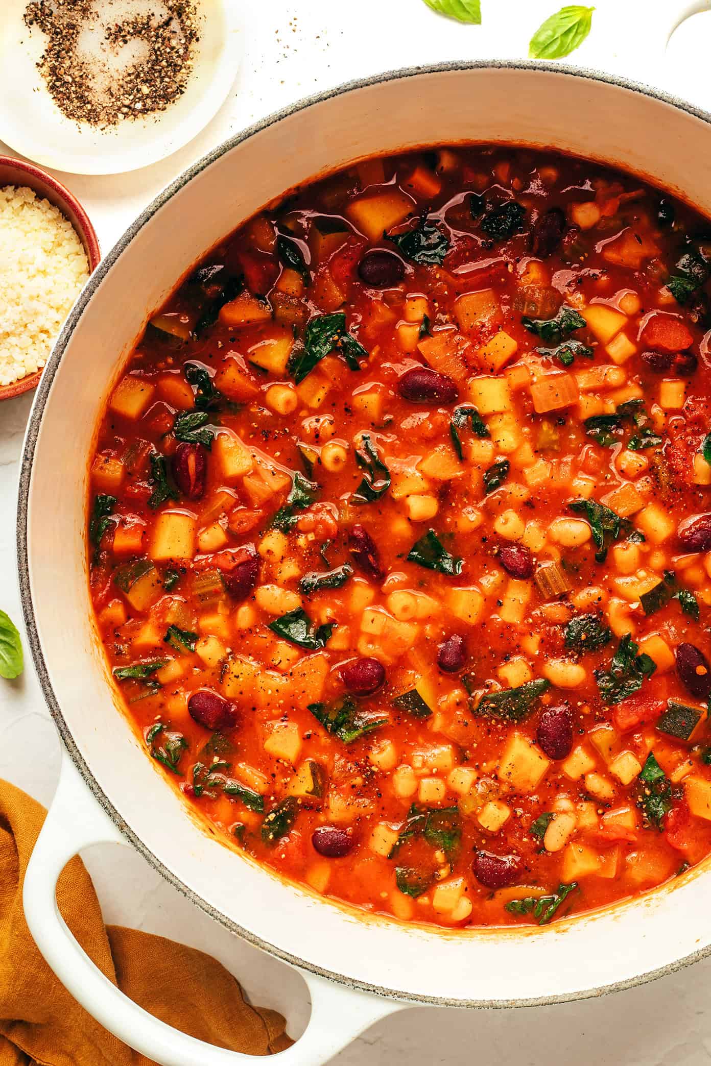 - Use what you have. Minestrone is famously flexible! Swap in whatever veggies you have in the fridge — green beans, peas, cabbage, or bell peppers all work beautifully.
