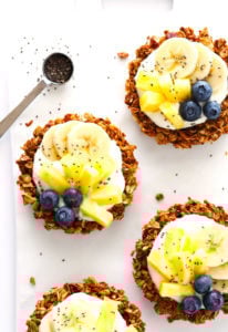 - Gently remove the granola tarts from the pans, fill with your desired fillings and serve immediately. ย Or, carefully transfer the tarts to an airtight ziplockย bag and store for up to 7 days.