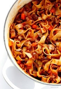Well, either way, I’m completely hooked on all things Downton again, and can pretty much guarantee you that the next few weeks’ worth of recipes here on the blog will be cooked in my kitchen with their adventures on in the background. I was channeling my own Mrs. Patmore this past week as I whipped up this vegetarian/vegan version of a classic bolognese pasta. It’s chock-full of various kinds of mushrooms (use whatever you can find!), and it’s definitely so delicious and hearty that I promise you won’t miss the beef.