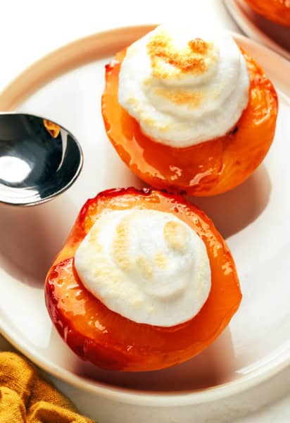 - Place a dollop of meringue on each peach half and return to the broiler for 10-15 seconds. Turn off broiler and leave peaches in oven just until tips of meringue are browned, 20-30 seconds. (Watch very carefully so that the meringue does not burn.)