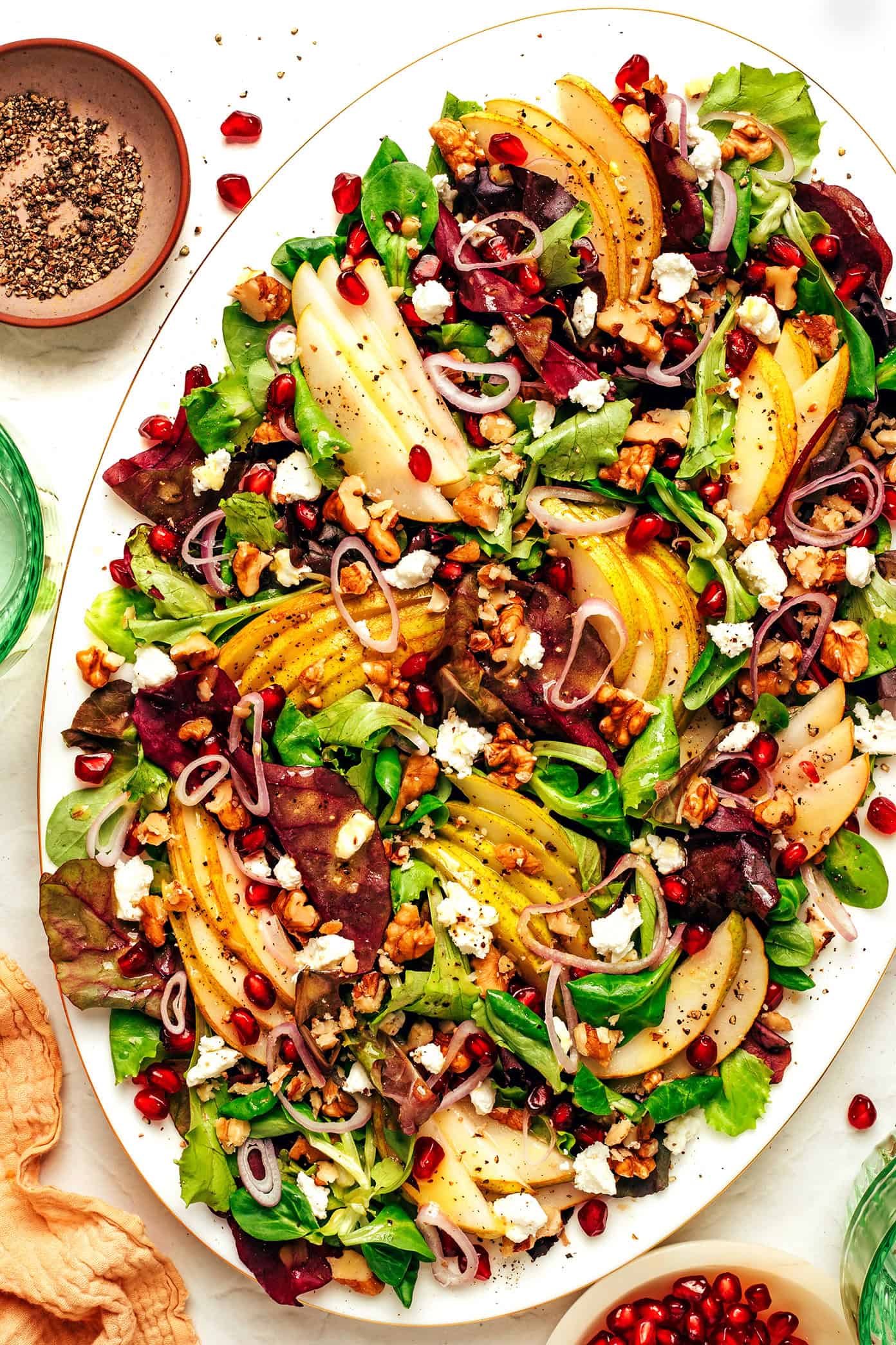 This pear salad recipe features juicy pears, creamy goat cheese, toasted walnuts, pomegranate arils, and a light white balsamic dressing — a fresh and elegant salad that’s perfect for any occasion!