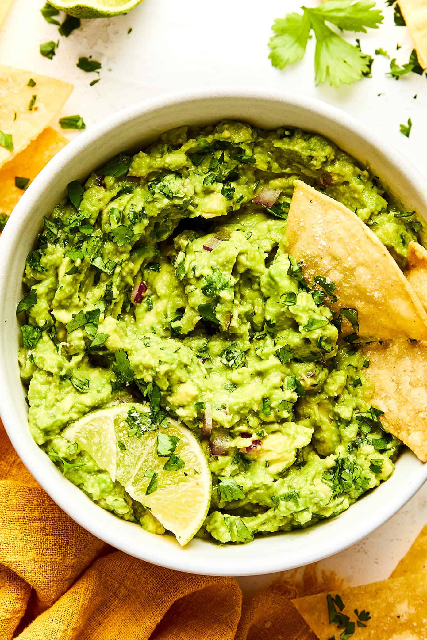 Of course, there are a million ways to use put this guacamole recipe to delicious use as well. It’s perfect for spreading on toast and burgers, topping your tacos and nachos, loading up your baked potatoes and deviled eggs, filling your quesadillas and wraps, and serving alongside any number of Mexican dishes. But about 99% of the time, we just serve it up with a big bowl of tortilla chips (plus maybe some homemade salsa and a round of margaritas). And I’m telling you — this guac recipe is always, always a winner.
