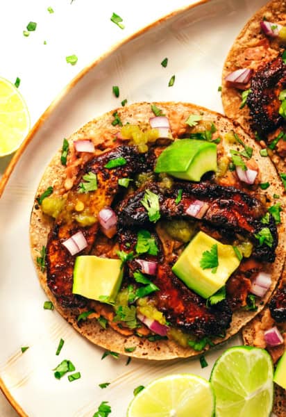 These portobello tacos are quite simply some of the most flavorful and satisfying vegetarian tacos I’ve ever made…and I can’t wait for you to try them! They feature portobello mushroom caps, which are thickly sliced to retain their meaty texture, briefly marinated in a simple 5-ingredient sauce, and sautéed to crispy, juicy, flavorful perfection. They’re then layered with my favorite refried beans in soft corn tortillas, drizzled with salsa verde, and finished with a sprinkling of your favorite fresh toppings. Each bite is perfectly balanced with hearty and light textures, bold and fresh flavors, and seriously could not be more delicious!