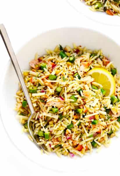 I thought it would be fun to mix things up with the usual pasta salads that I tend to make this time of year. So for something different, I flaked up a filet of smoked salmon and tossed it with some chopped asparagus, herbs, pine nuts, Parmesan and a quick lemony dressing. And you guys — this simple orzo salad was such a winner!