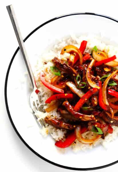 - Veggies: Speaking of, any stir-fry-friendly veggies will also work well here. I kept mine simple, and just went with red bell peppers and onions. But broccoli, asparagus, mushrooms, carrots, or greens would all be delicious too!