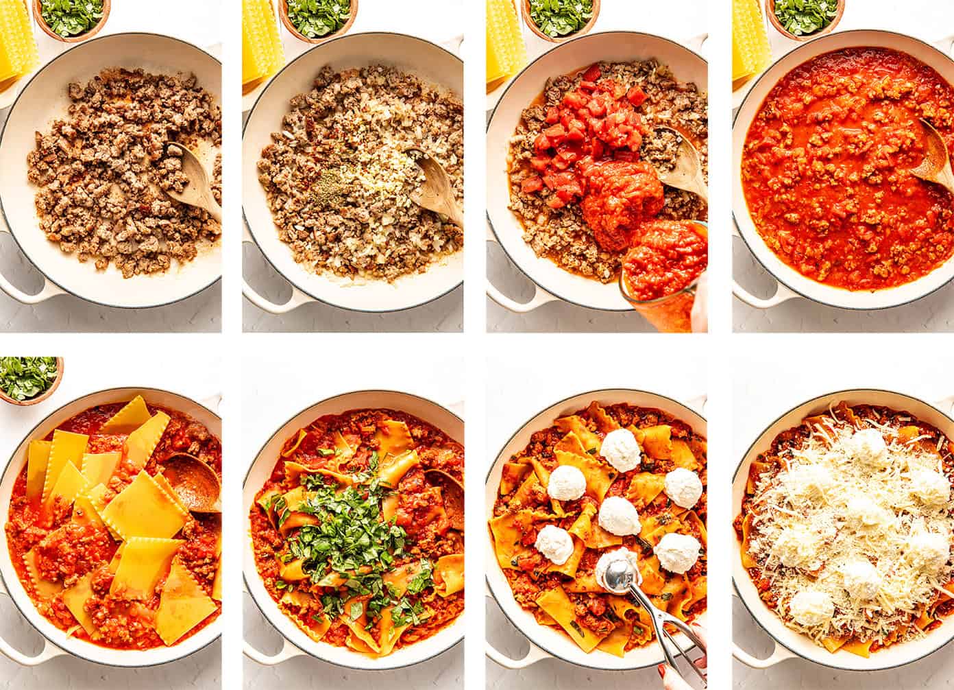 - Add noodles. Nestle broken lasagna noodles into the sauce, pressing so theyโre mostly submerged. Cover the skillet, reduce heat to medium-low, and simmer for 20โ25 minutes, stirring occasionally and adding a splash more water if needed, until noodles are just tender.