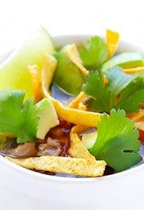 - toppings: tortilla chips (strips or crushed), diced avocado, light sour cream, fresh cilantro, lime wedges
