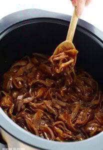 Lid Ajar:ย The onions will definitely release lots of natural juices while cooking, which can make the onions slightly soupy near the end. So if you would like that liquid to evaporate, thus making your onions a little thicker and “jammier”, just set the slow cooker lid slightly ajar (1-inch of so) for the final few hours of cooking.