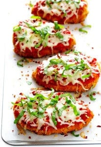 Feel free to go the traditional route and serve the baked chicken parmesan over a bed of pasta. Or I also just love serving it alongside some roasted veggies and a big Italian salad for a healthier twist. (Or for a different twist, feel free to cut the chicken up into bite-sized pieces and make chicken parmesan nuggets, just being sure to cut down on the baking time.) ย You choose.