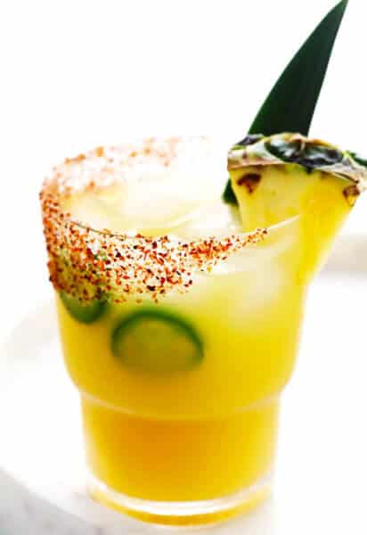 This spicy pineapple margarita recipe is easy to make and perfectly balanced with the most delicious sweet, spicy and smoky (if you opt for mezcal) flavors. Large-batch pitcher recipe included in the notes below.