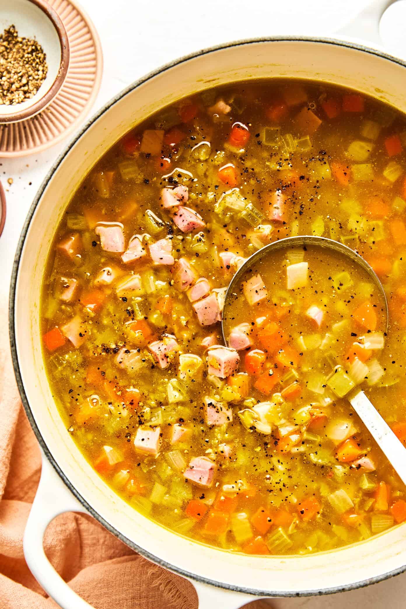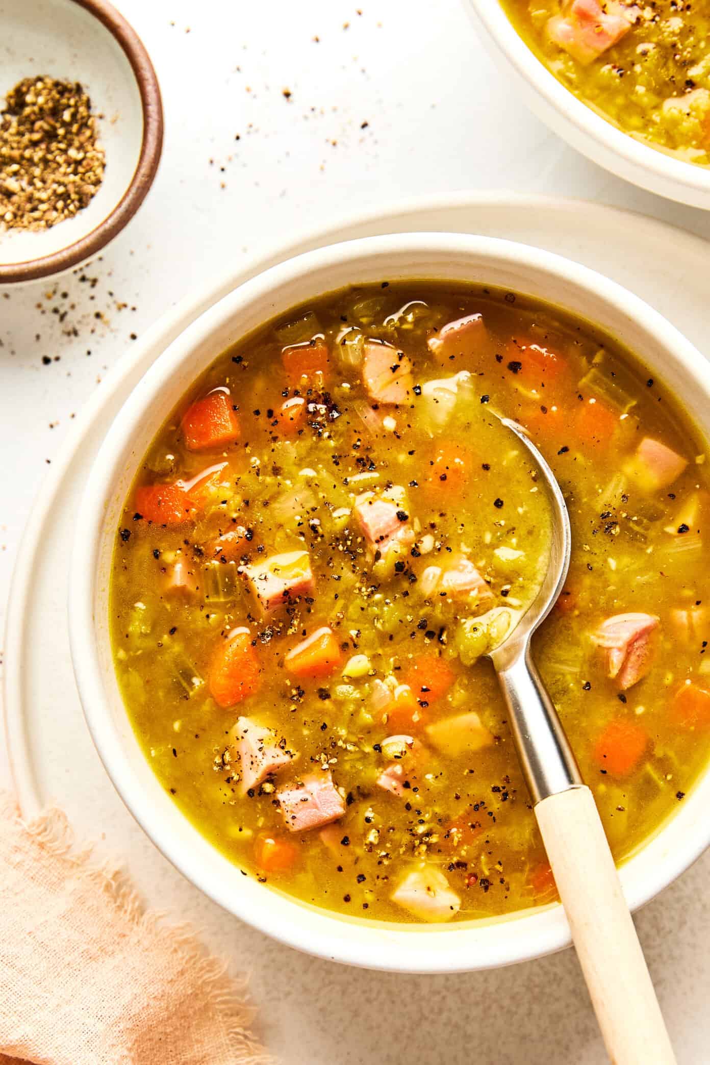 This cozy split pea soup recipe uses leftover ham, tender split peas, basic veggies and pantry staples to create a rich and comforting soup thatโs full of flavor.