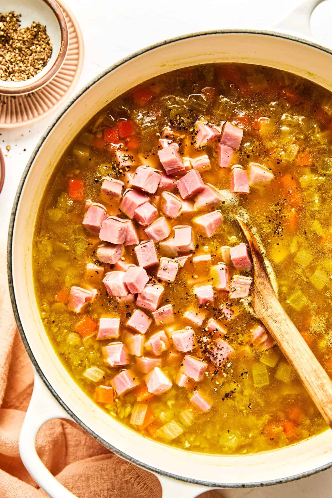- Season at the end. Ham hocks and broth can vary majorly in saltiness, so wait until the soup finishes cooking before adding salt.